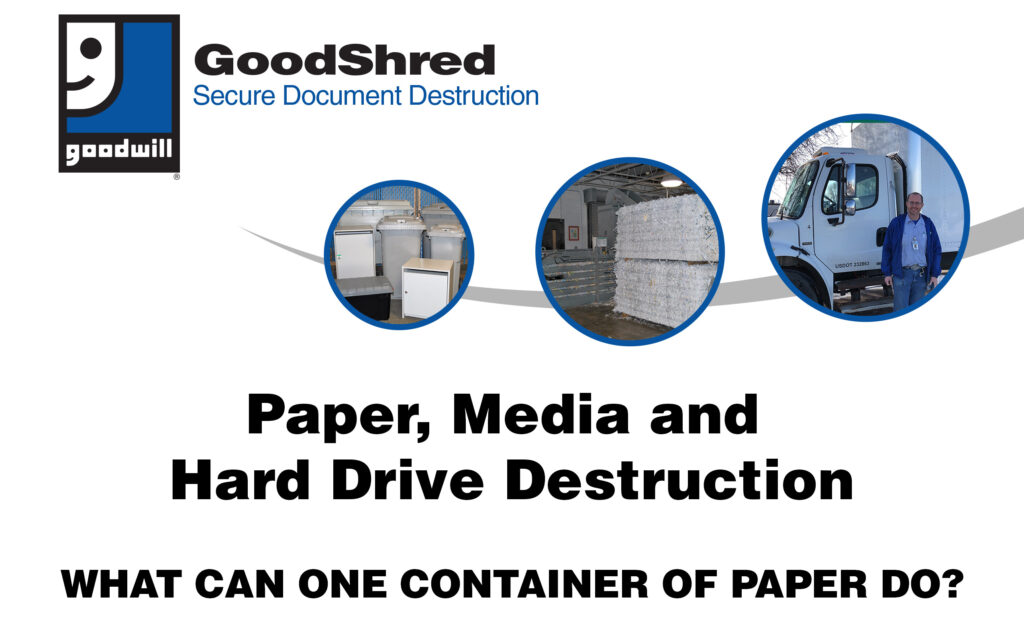 Goodwill believes in creating a world of dignity and compassion by helping people gain valuable job skills to find employment. The average collection container diverts 200 pounds of paper from landfills and provides two hours of job coaching for individuals in Goodwill programs.